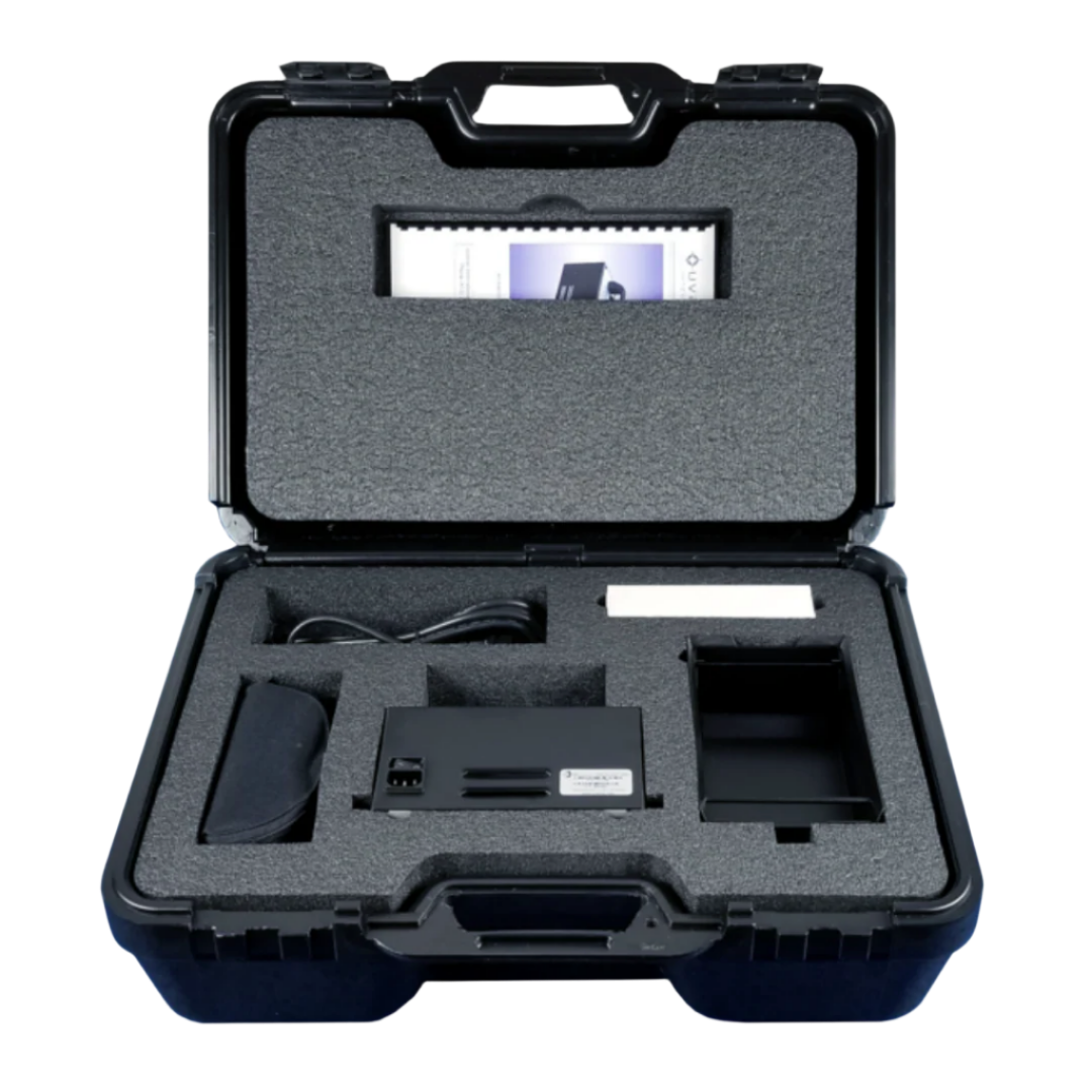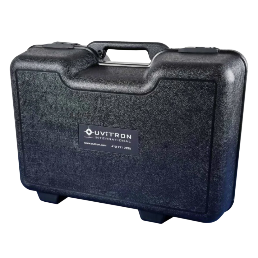 Rugged, foam-lined carrying case designed for safely transporting the PortaRay UV lamp system. Custom-cut compartments securely hold the lamp head, UV safety glasses, headrest, power cord, spare lamp, and instruction manual.